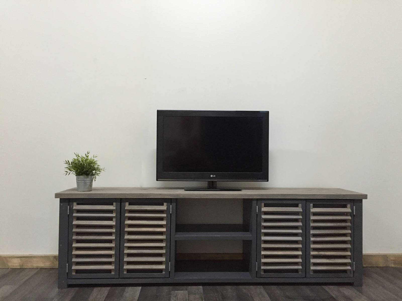 Prachtig TV meubel model Winona in combinatie met steigerhouten salontafel Rosewell. Het TV meubel is voorzien van shutters en heeft een landelijke uitstraling.