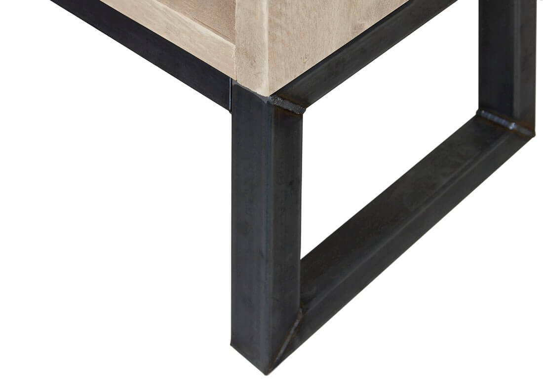 Industriële meubelen worden handgemaakt met steigerhout en staal. Voor de behandeling van het steigerhout kun je hier meer lezen. Door de ambacht kunnen poten altijd iets van elkaar afwijken en kunnen de poten lasspetters bevatten, dit hoort bij het product.