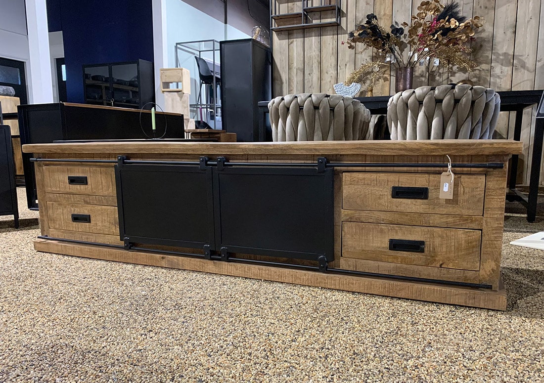 Mangohout tv-meubel Suze met schuifdeuren en 4 lades